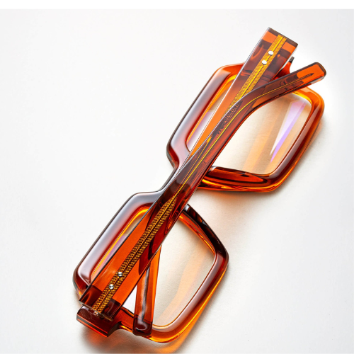 Transparentny bursztynowy odcień wnosi ciepło i subtelną głębię, pięknie współgrając z naturalnym kolorytem skóry. Kolor pracuje ze światłem, tworząc efekt lekkości i szlachetności, dzięki czemu oprawa pozostaje wyrazista, ale nie dominuje twarzy.