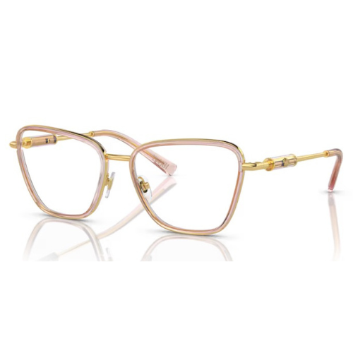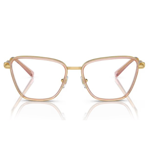 Model MOD1292 od Versace to oprawa, która łączy subtelność i wyrazistość w jednym. Jej kształt butterfly dodaje twarzy lekkości i elegancji, a przezroczysty brzoskwiniowy front pięknie komponuje się ze złotymi zausznikami, tworząc harmonijną całość o biżuteryjnym charakterze.