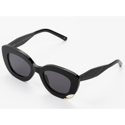 Głęboka czerń acetatu podkreśla rzeźbiarski profil oprawy i sprawia, że model staje się niezwykle uniwersalny – doskonale dopełni zarówno minimalistyczne stylizacje, jak i bardziej wyraziste, wieczorowe looki. Miękkie krzywizny i wyraźna linia górna tworzą harmonijną, a zarazem odważną formę.